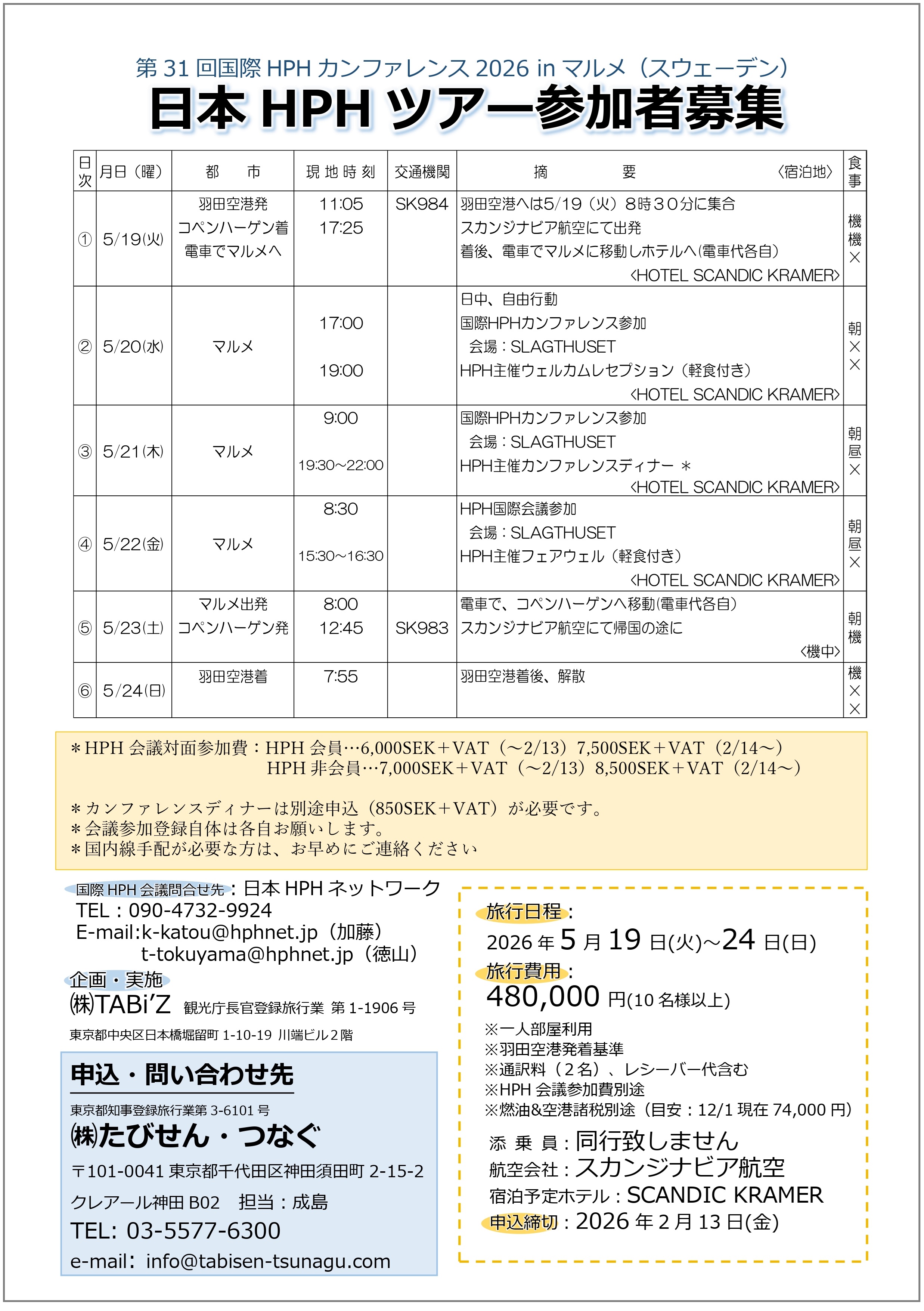 - HPHカンファレンス参加費・カンファレンスディナー別途