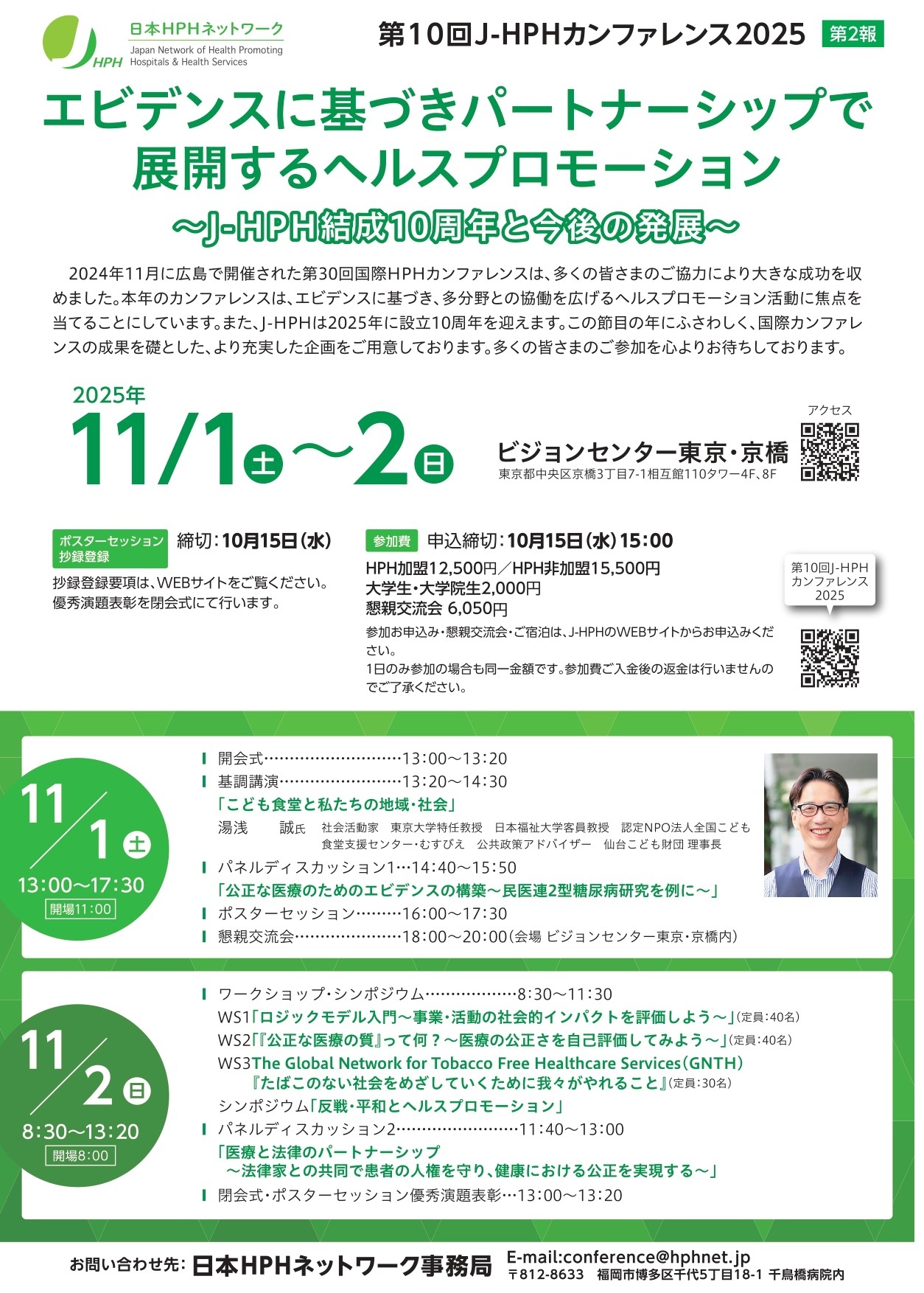 エビデンスに基づきパートナーシップで展開するヘルスプロモーション ~J-HPH結成10周年と今後の発展~ 2025年11月に広島で開催された第30回国際HPHカンファレンスは、多くの皆さまのご協力により大き … 続きを読む 第10回J-HPHカンファレンス2025【第2報】